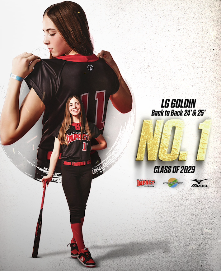 On April 4, Lilah Grace (“LG”) Goldin, a speedy power-hitting shortstop for the Georgia Impact team coached by Jason Cleghorn, was named as the No. 1 prospect in the Class of 2029 Line Drive HOT 100 for the second straight year.