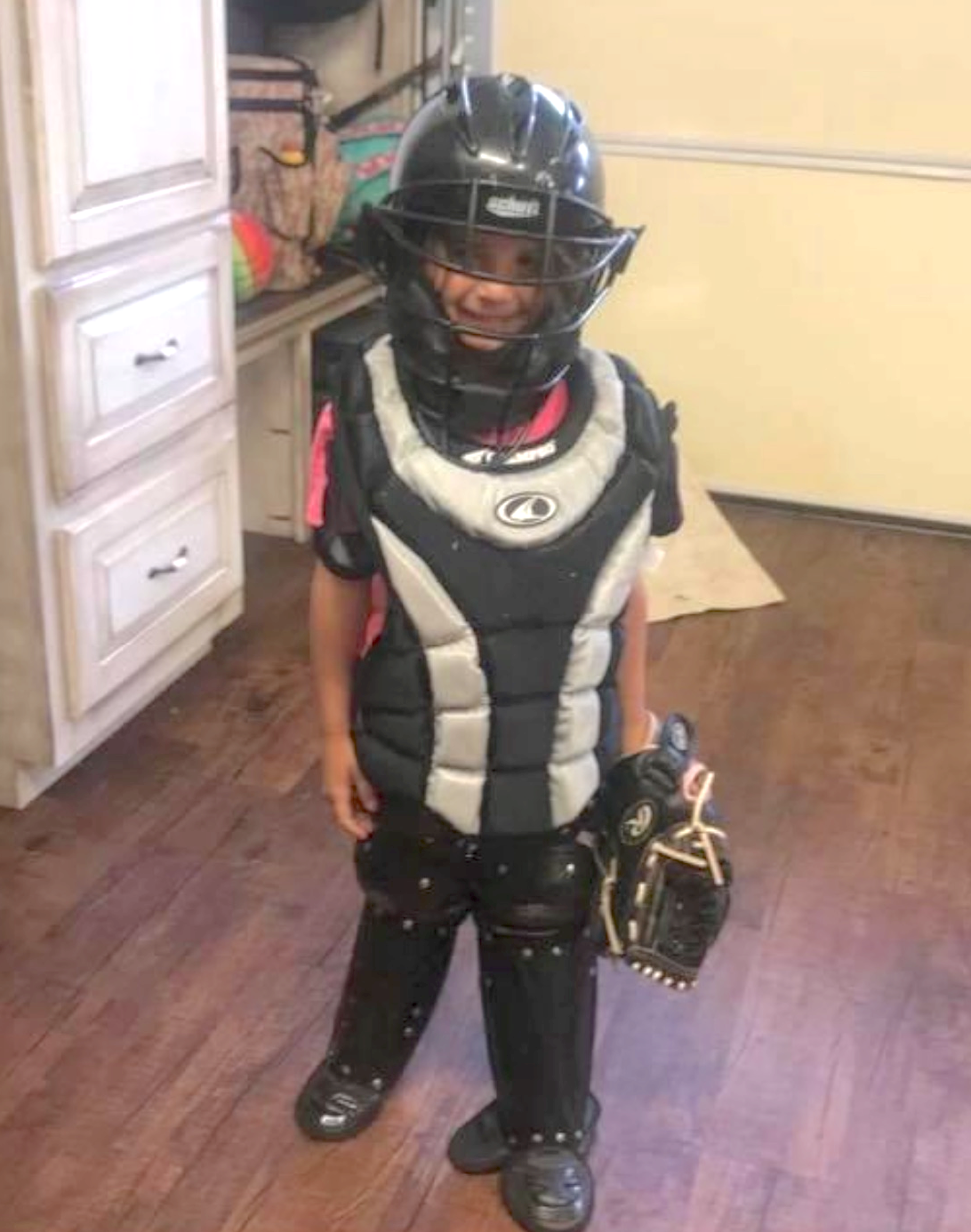 Avery tries on her sister’s catching gear at a very young age!