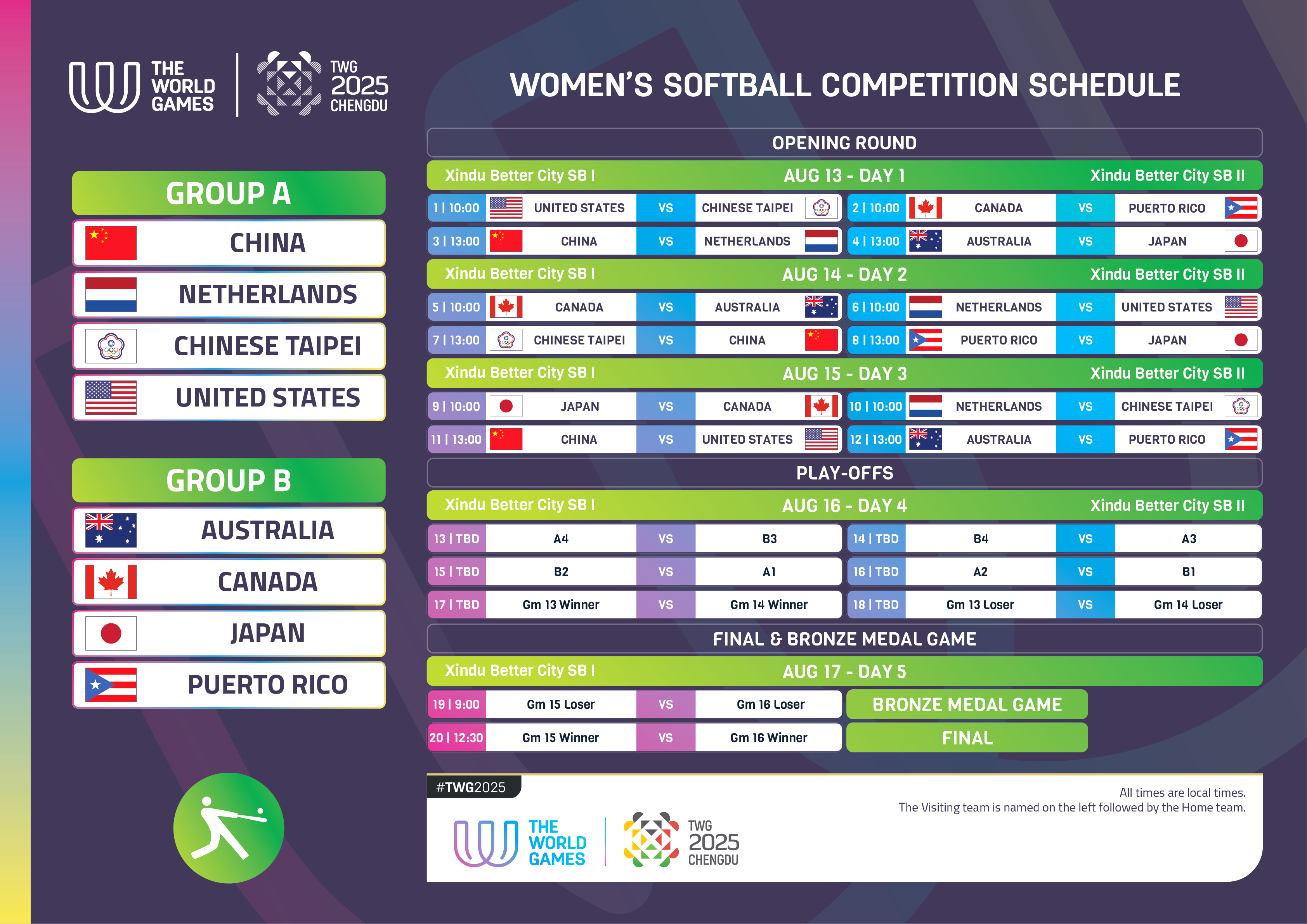 The World Baseball Softball Confederation (WBSC), the International World Games Association (IWGA) and the Chengdu 2025 Local Organizing Committee has announced the groups and schedule for The World Games 2025 softball events.