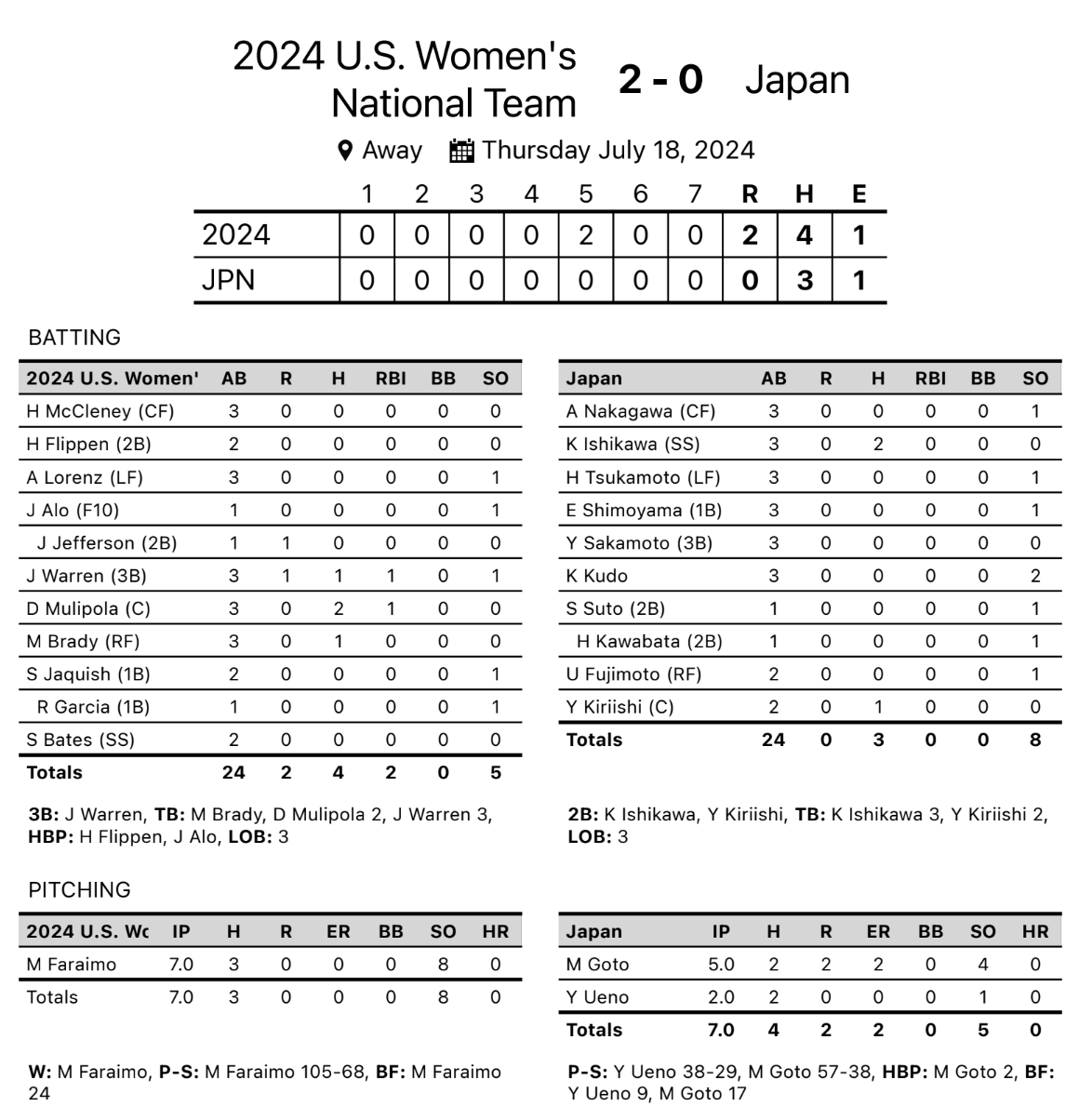 In true USA vs Japan fashion, the matchup proved to be a defensive showdown with neither side able to break the silence through four innings until a hit-by-pitch to Jocelyn Alo set the stage for Warren to send an RBI triple to right field that plated one in the top of the fifth.
