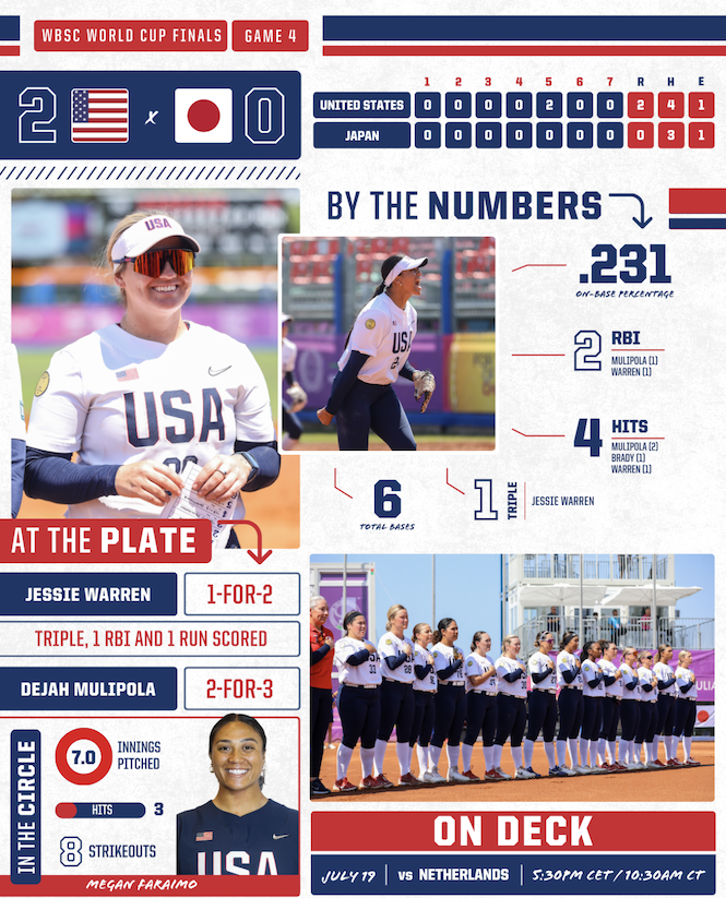 The world-ranked No. 1 U.S. Women’s National Team (WNT) continued to prove dominant at the 2024 World Baseball Softball Confederation (WBSC) World Cup Finals after a thrilling 2-0 victory over Japan Thursday on Day 4 of the tournament.