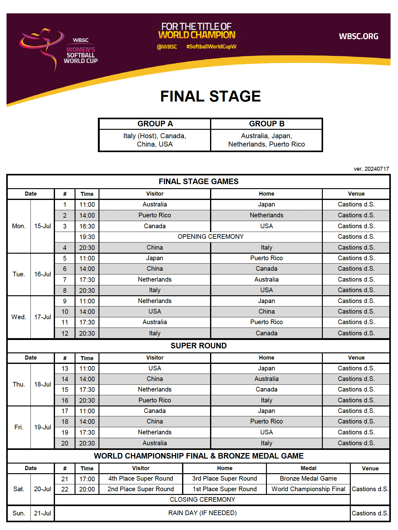 The WBSC Women’s Softball World Cup Finals will be streamed via GameTime. Fans will have the option of two different services: Tournament Pass ($12.99) or Daily Pass ($7.99). Tournament Pass subscribers will have full access to all 22 games of the WBSC Women’s Softball World Cup Finals. For more information on subscriptions, click here. Fans will also have the opportunity to follow along via live stats by following the U.S. Women’s National Team on GameChanger.
