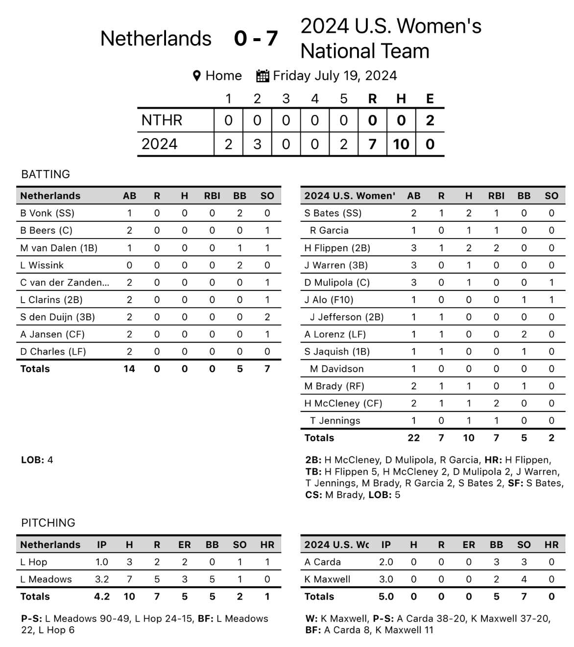 Leading the U.S. through its undefeated performance is Flippen with a .500 batting average, followed by Maya Brady (.462) and Jessie Warren (.429).