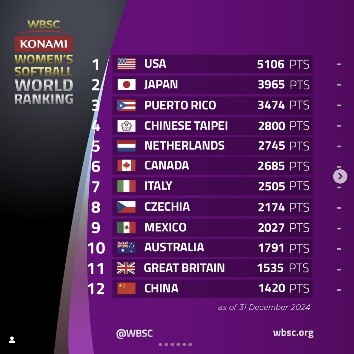 For the women’s competition, World No. 1 USA; No. 2 Japan; No. 3 Puerto Rico; No. 4 Chinese Taipei; No. 5 Netherlands and No. 6 Canada have qualified for the multi-sport competition as the top six in the World Ranking, while No. 12 China will participate as host team.