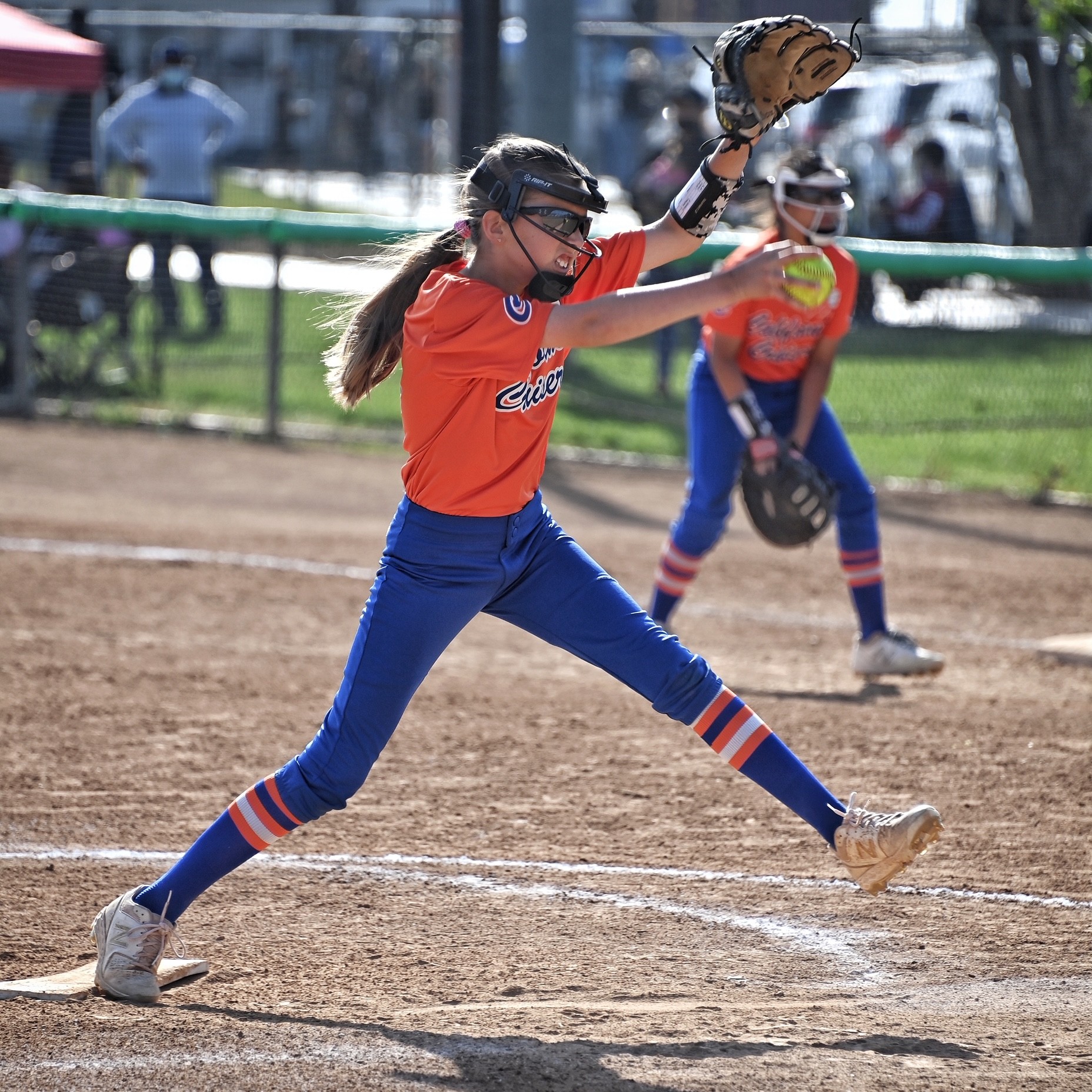 The young pitcher shows the intensity on her face that drives her to succeed.
