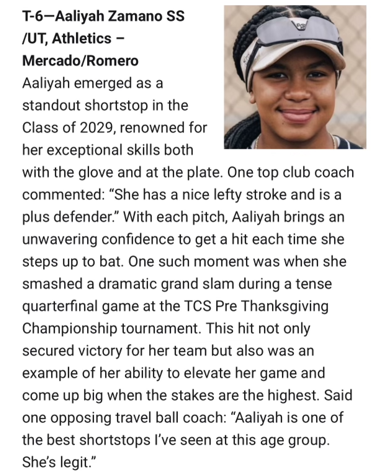 Aaliyah is ranked 6th overall in the 2029 Line Drive HOT 100 Rankings.