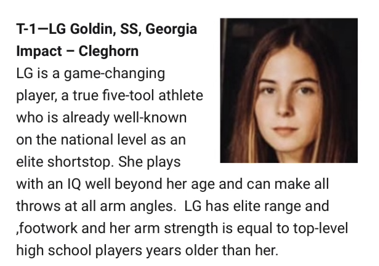 The intro to LG Goldin bio in the 2029 Line Drive HOT 100 ranking her tops in her class.