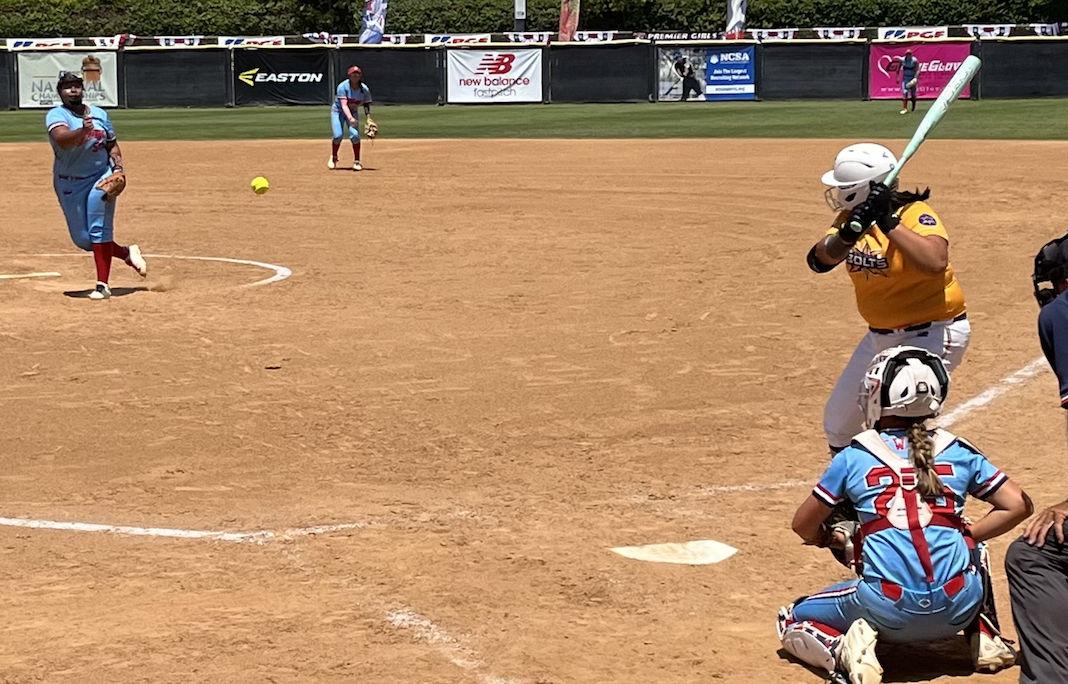 After a quiet top of the first inning for the Texas Blaze—the visiting team in a game that was the first and only one of the five championship games in Week 2 that didn’t have at least one Cali team—the Birmingham Thunderbolts 2030 team came up to bat and looked like they were late and in a hurry to catch their flight home to Alabama.