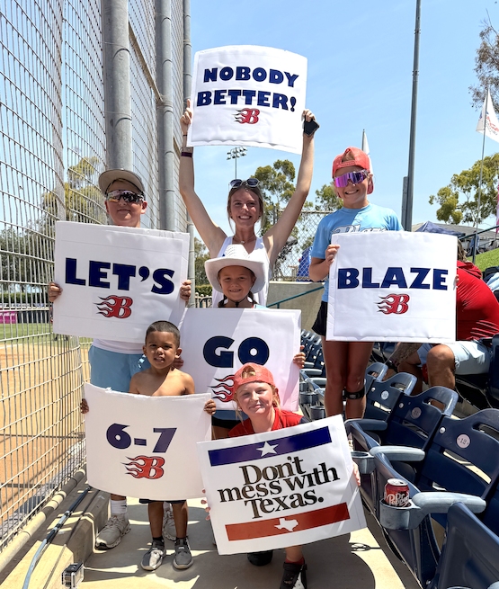 In the top of the 5th inning, the Blaze batted around with Kennedy Keel starting the inning with a shot down the first base line that hit the bag for a single. She would steal second and advance to third on a wild pitch which seemed to energize not only the Blaze dugout, but the team’s fans from Texas.