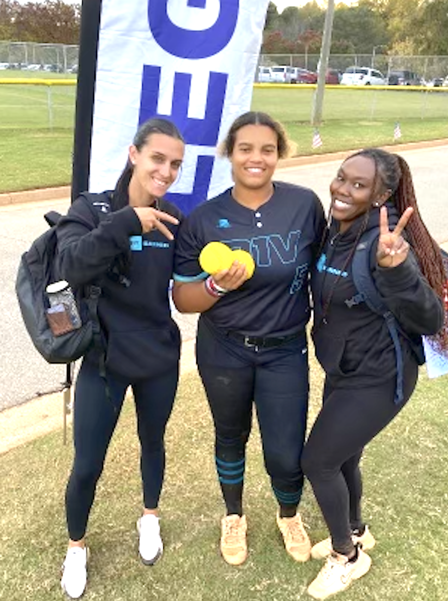 Jaliya holds two of her home run balls at the Atlanta Legacy Invitational with D1VISION Coach Tammy (left) and Coach Dorian (right).