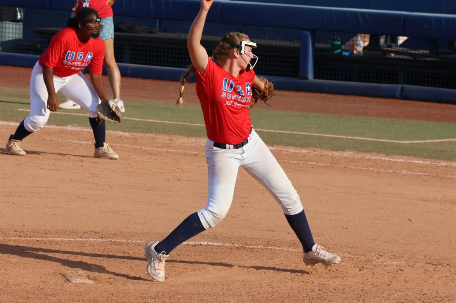 USA Softball All-American Games Stats: Pitching — 11.0 IP, 3 GP, 2 GS, 45 BF, 9 hits, 0 R/ER, 3 BBs, 19 Ks, 0.00 ERA, 1.091 WHIP and .214 BAA.