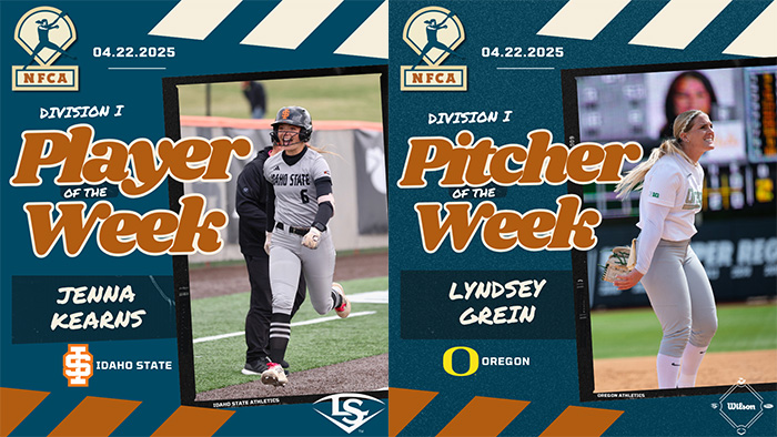 Idaho State’s Jenna Kearns and Oregon’s Lyndsey Grein were tabbed Division I Louisville Slugger/NFCA Player and Wilson/NFCA Pitcher of the Week, respectively, for contests played April 14-20. It marks the second honor this season for Grein.