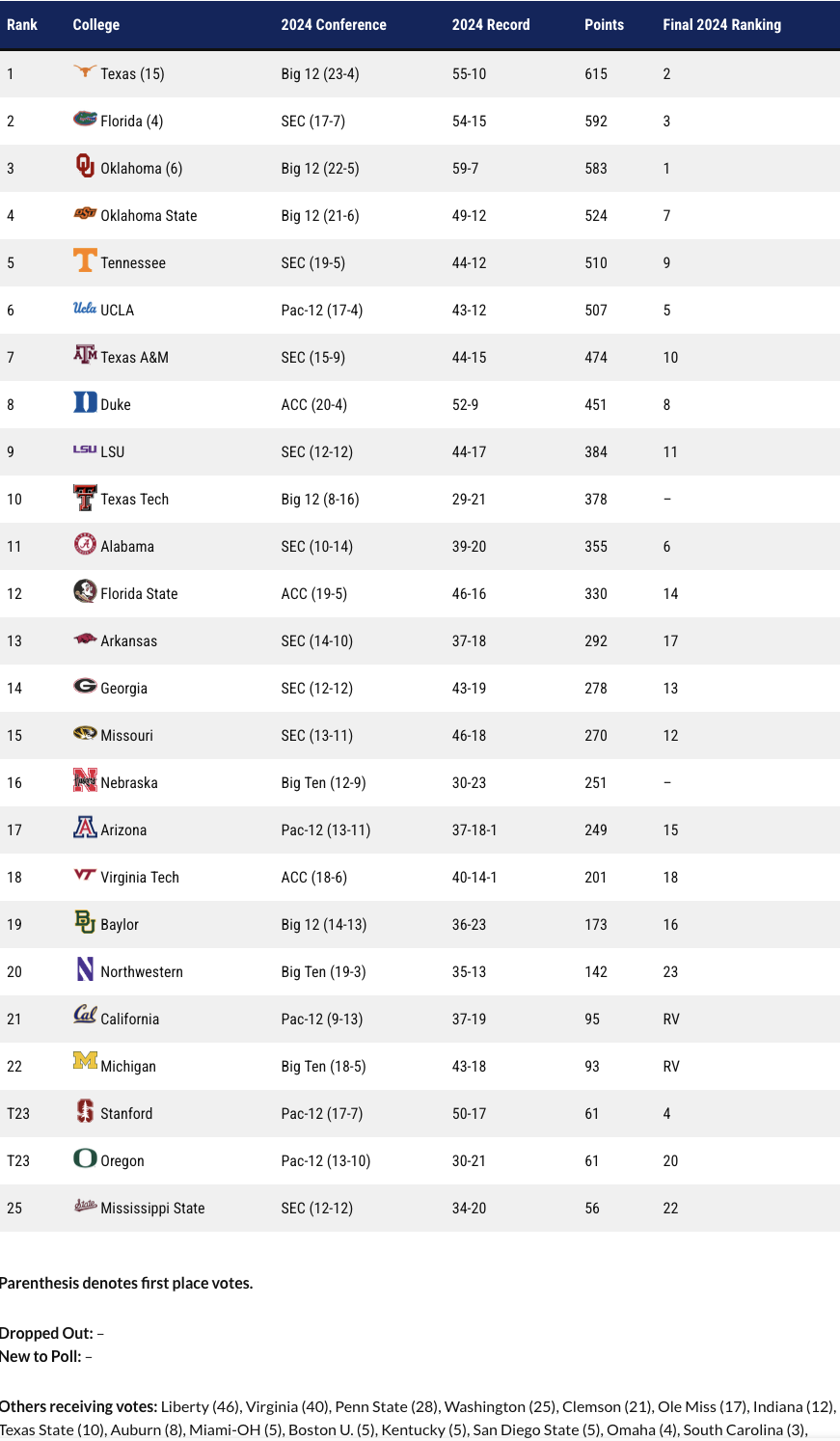 College News: ESPN.com/USA Softball’s Preseason Top 25 Poll (Jan. 22, 2025)