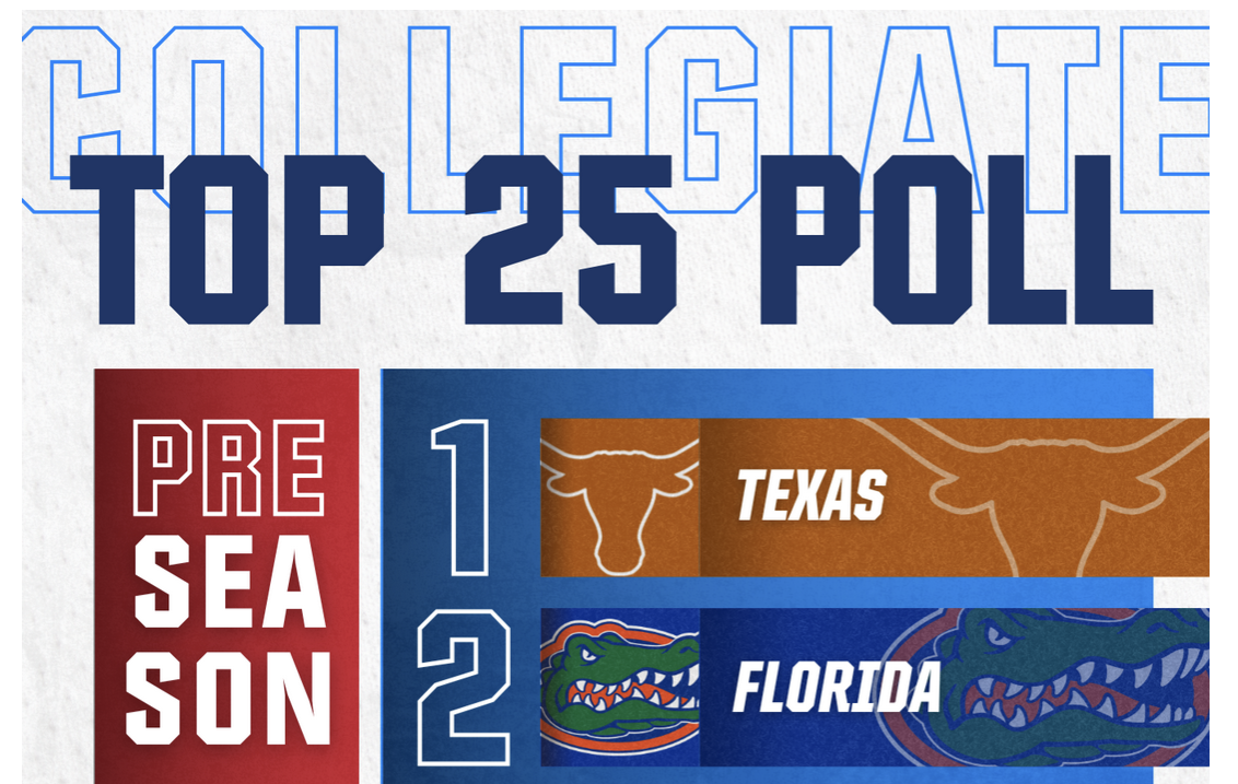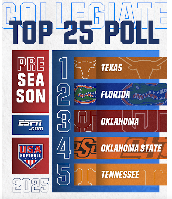 Texas and Florida lead the College Preseason Top 25. Image from ESPN.com/USA Softball.