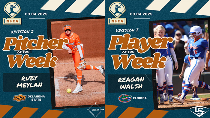 Florida’s Reagan Walsh and Oklahoma State’s Ruby Meylan captured the Division I Louisville Slugger/NFCA Player and Wilson/NFCA Pitcher of the Week honors for contests played Feb. 24-March 2.