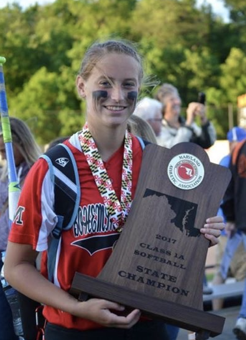 Maddie won three Maryland Class 1A high school state titles and in one of the state championship games tossed a no-hitter with 19 strikeouts.