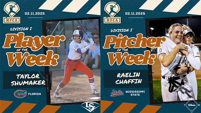 Florida’s Taylor Shumaker and Mississippi State’s Raelin Chaffin collected the first weekly awards of 2025, earning Division I Louisville Slugger/NFCA Player and Wilson/NFCA Pitcher of the Week honors for contests played Feb. 6-9, 2025.