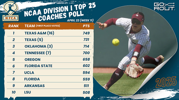 Texas A&M remained the No. 1 team in this week’s NFCA/GoRout Division I Top 25 Coaches Poll.