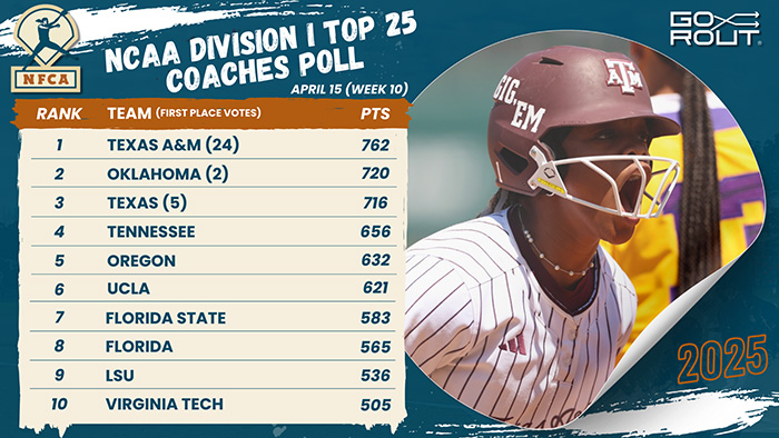 The 2025 NFCA/GoRout Division I Top 25 Coaches Poll is voted on by 31 NCAA Division I head coaches with one representing each of the NCAA’s Division I Conferences. The poll will be released on Tuesdays at 10:00 a.m. ET during the regular season. Records reflect games played through April 13.