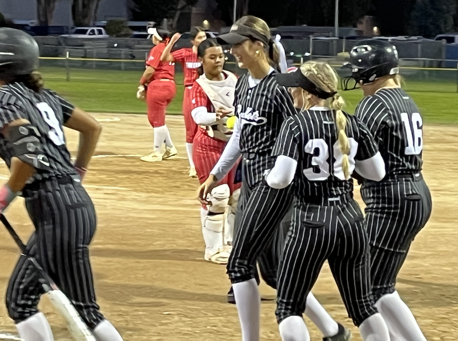 Myleigh Cooper (#16) is congratulated after her two-run home run for the NW Bullets 18U team Saturday evening.