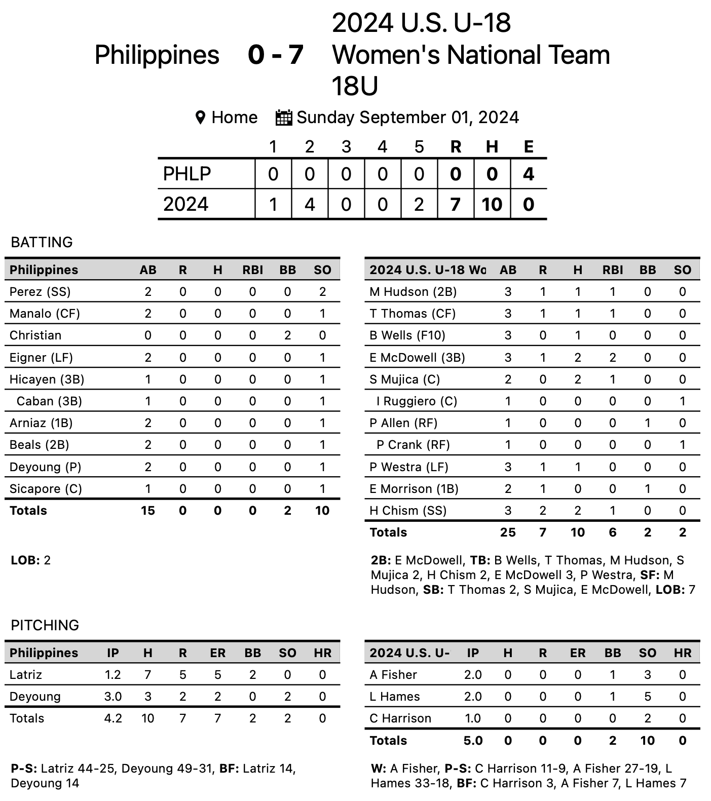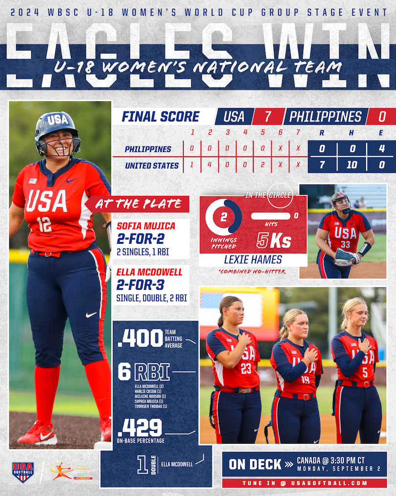 DALLAS, Texas (September 1, 2024) — Team USA improved to 5-0 at the 2024 World Baseball Softball Confederation (WBSC) U-18 World Cup Group C Stage Event following a 7-0 run-rule victory over the Philippines to close out opening round and advance to the final contest as the No. 1 seed in Group C.