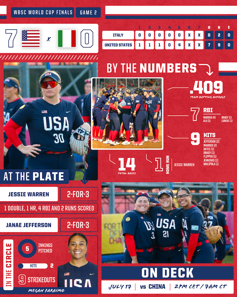 The Italy defense managed to silence the U.S. offense through the fourth, but a pair of singles and a bases-loaded double from Warren extended the lead, 6-0 in the bottom of the fifth.
