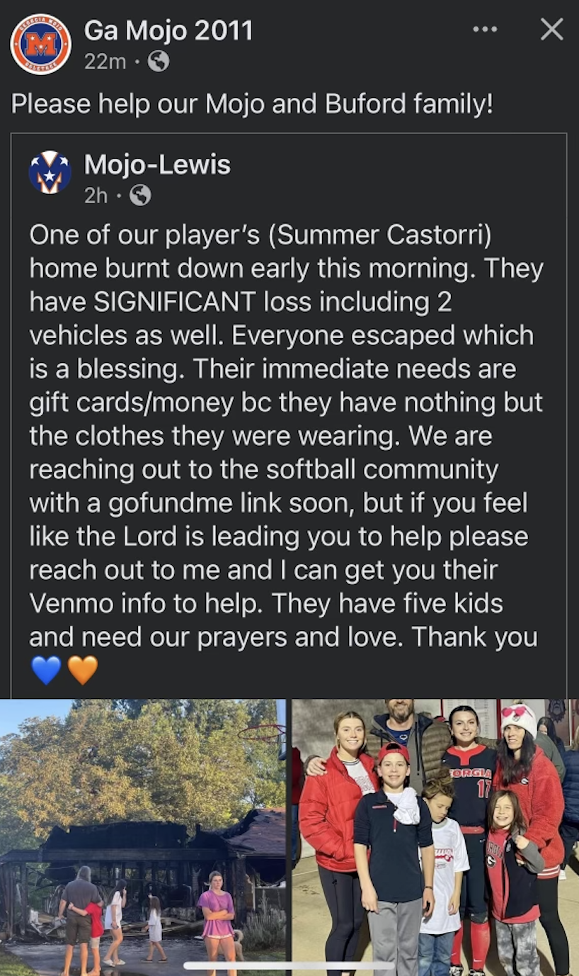 Take the awful incident last week where the Castorri family—led by parents Christian and Jen Castorri and softball-playing daughters Emma, a current sophomore utility player at the University of Georgia, and Summer, a standout 2026 athlete who plays for the Mojo travel ball team coached by Brittany Lewis—lost their home in Buford, Georgia, due to a devastating house fire.