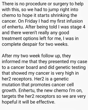 “I am very sick and weak from the chemo and need all the help I can get. Even before the chemo I had significantly declined physically in the last couple weeks due to the fast spreading of the cancer. I am asking for any amount of donation that anyone can help with. Your donations will go toward:
