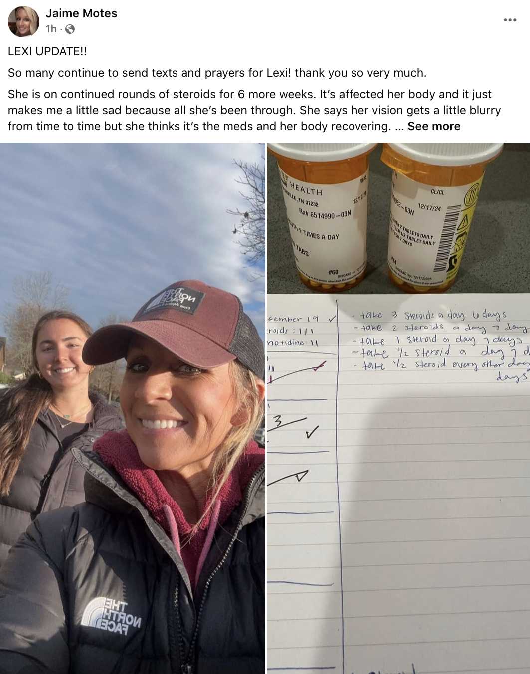 Mom Jaime posted on Facebook today (Dec. 24, 2024) an encouraging update.
