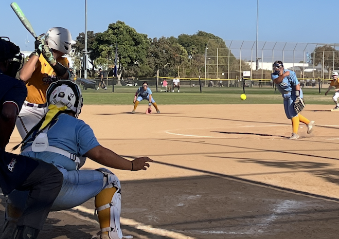 Wednesday action in the 14U age division between Birmingham Thunderbolts - Brashears (yellow) and Team San Diego - Baca.